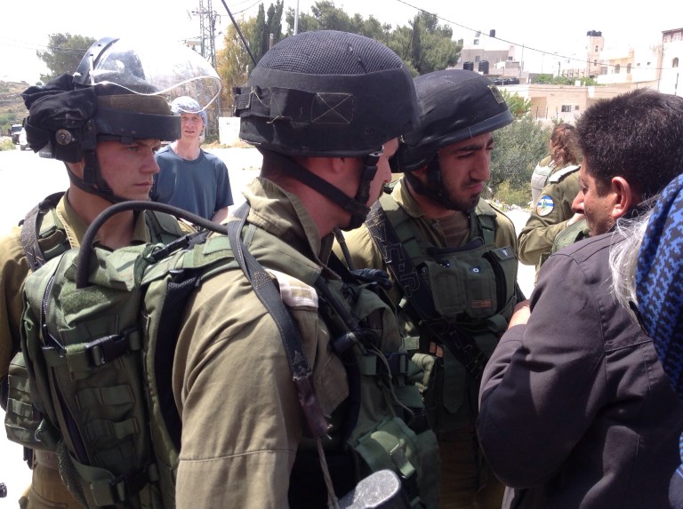 We meet the wall of armed soldiers ten minutes later. They move together like a caterpillar to block the way of Palestinians as they attempt to get through the blockade at first. We internationals are not stopped but then stand rather uselessly on the other side, not knowing what to do, so come back through to stand beside our hosts as they are eyeballed by the boys with guns.