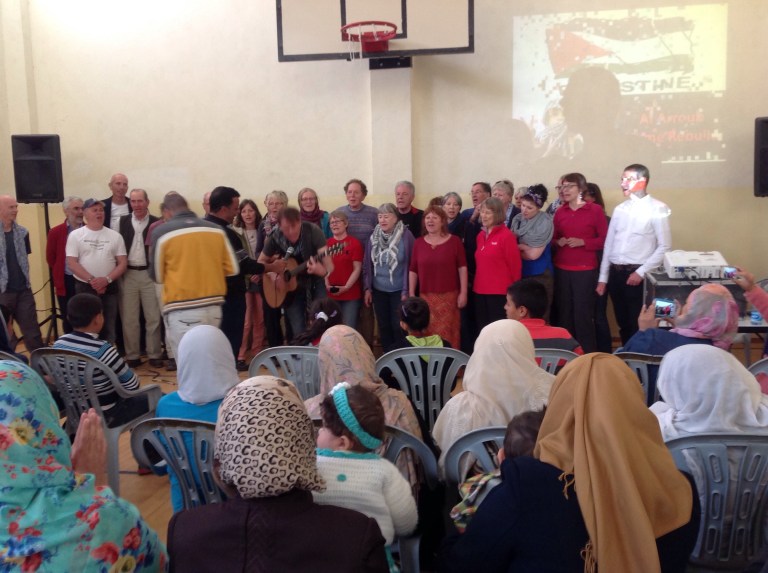 The Amos Trust volunteers are now all ‘on stage’ and Martin steps out front. With one practice behind us we launch into a choral backing of his powerful rendition of ‘we shall overcome’ and the place erupts. My new beautiful friend sits at the front, her face covered in flowing tears.